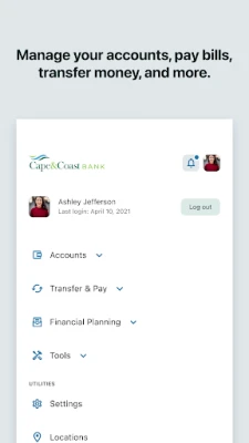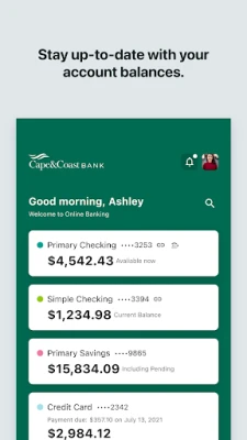 With free Mobile Banking from Cape & Coast Bank, you can manage your money anytime, anywhere. Check account balances, transfer funds, deposit checks, and pay bills—right from your mobile device. Looking for a nearby branch or ATM? The app makes that easy, too.