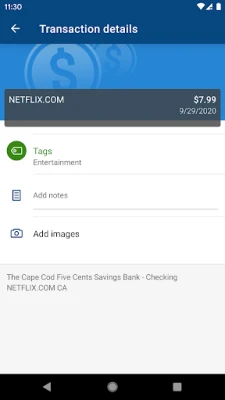 Add Tags, Notes, Images & Geo-Information: By enhancing transactions with custom tags, notes or photos of a receipt or check, you have the ability to stay organized and find exactly what you’re looking for when searching through your finances.