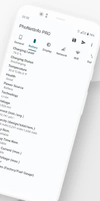 - Battery: Battery Health, Level, Status, Power Source, Technology, Temperature, Voltage, Capacity, Current, etc.
