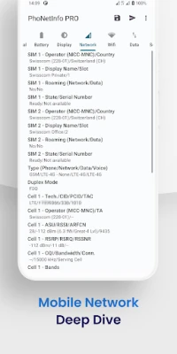 - Network: Network Operator, Network Type, MCC, MNC, IMEI, IMSI, Cell IDs, Signal Strength, ASU, LAC, CQI, RSRQ, Bandwidth, etc.