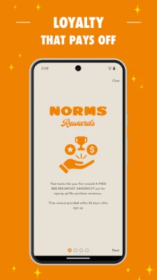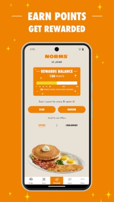 - What’s better than great food, great service, and great value? Earning 1 point for every $1 spent at NORMS! - Earn points with every purchase at any NORMS location, NORMS.com or NORMS Rewards app order - Redeem points for delicious rewards including…Ice Cream Sundae, Buttermilk Hotcakes, T-Bone Steak Dinner & more! - Receive a FREE reward* when you join! (*reward sent within 24 hours of signing up) - Free birthday reward! - Invite friends & family and earn bonus points! - Receive exclusive offers & challenges - Points expire after 180 days of inactivity