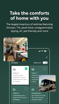 - Search by travel dates, vehicle type, sleeping capacity, cost, and location