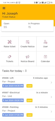 The app allows you to view and manage all tickets raised by residents and manage services provided by vendors in the building. Assign time and date for tickets under progress. View pending payments and remind the residents / Vendors on time! Add users and post notices with the click of a button, organise your tasks and communicate with residents pertaining to building management with ease.