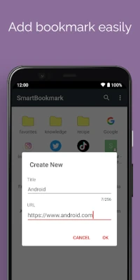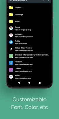 - Create bookmarks with one touch from the browser "Share" menu (compatible with various browsers such as Chrome and other standard Android browsers)