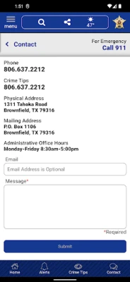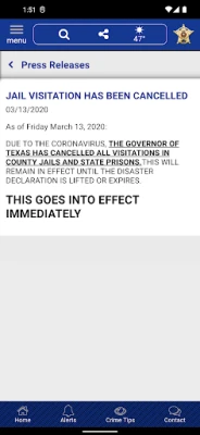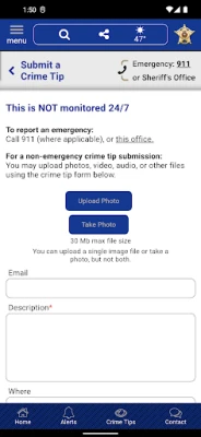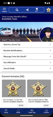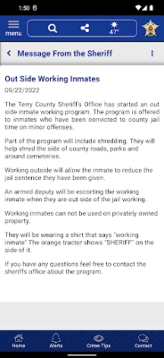 The app has public information for press releases, inmates, sex offenders, special alerts, and FAQ's. Crime tips and contact us messages can be sent to the Sheriff's Office.