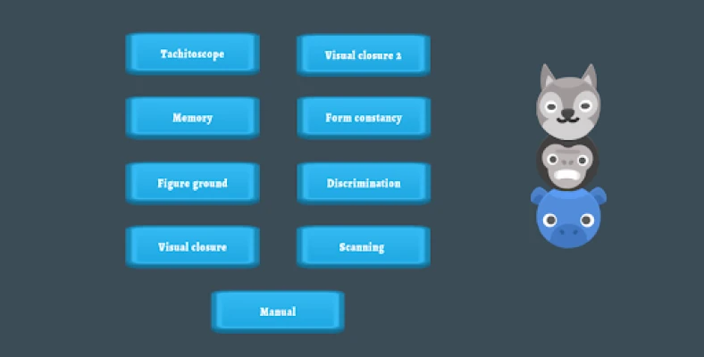 The program is used to exercise visual perception for children from 4 to 10 years old. It complements in-office therapy. It consists of eight modules: visual discrimination, figure-ground, form constancy, visual closure, visual closure 2, visual scanning, visual memory, tachistoscope.